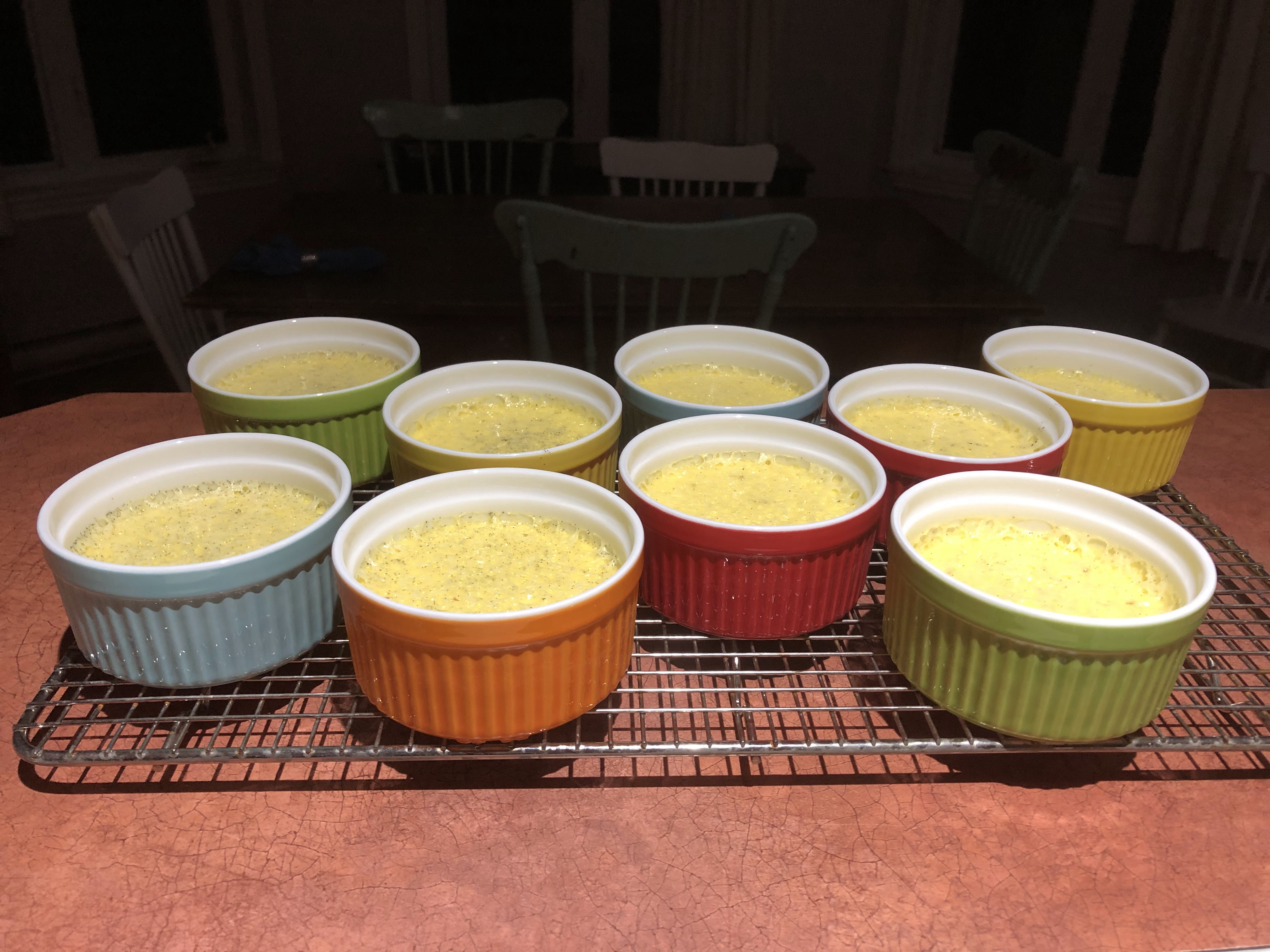 Remove the pan from the oven carefully – don’t slosh the water! Use tongs to carefully remove dishes from the hot-water bath (bain marie) and place on a wire rack for 30 minutes or more. Then cover with plastic wrap and chill for at least 2 hours (or up to 3 days) before serving. The custard will finish setting in the refrigerator but you don’t want condensation on the plastic wrap.