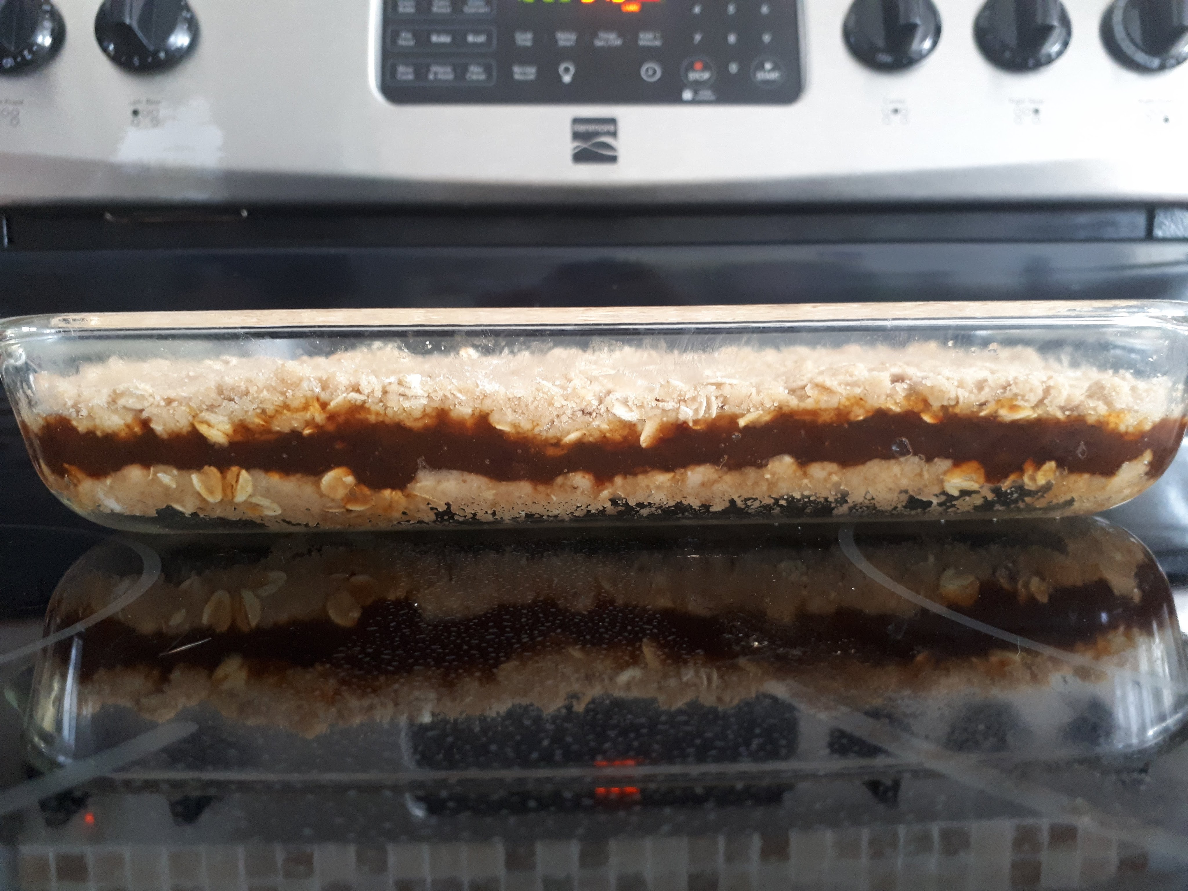 Preheat the oven to 375 F. Grease an 11×5 pan – odd size, I know, but it’s the magic. Mix the crumble ingredients well and press half into the bottom of the pan (damp fingers help). Spread the date filling evenly over the crust, making sure you go right to the edges. Crumble the rest over top and press gently – try to cover all the date filling. Bake for 25-30 minutes or until golden brown – your nose will know when they’re ready. Cool all the way before cutting into squares, hard as that might be.